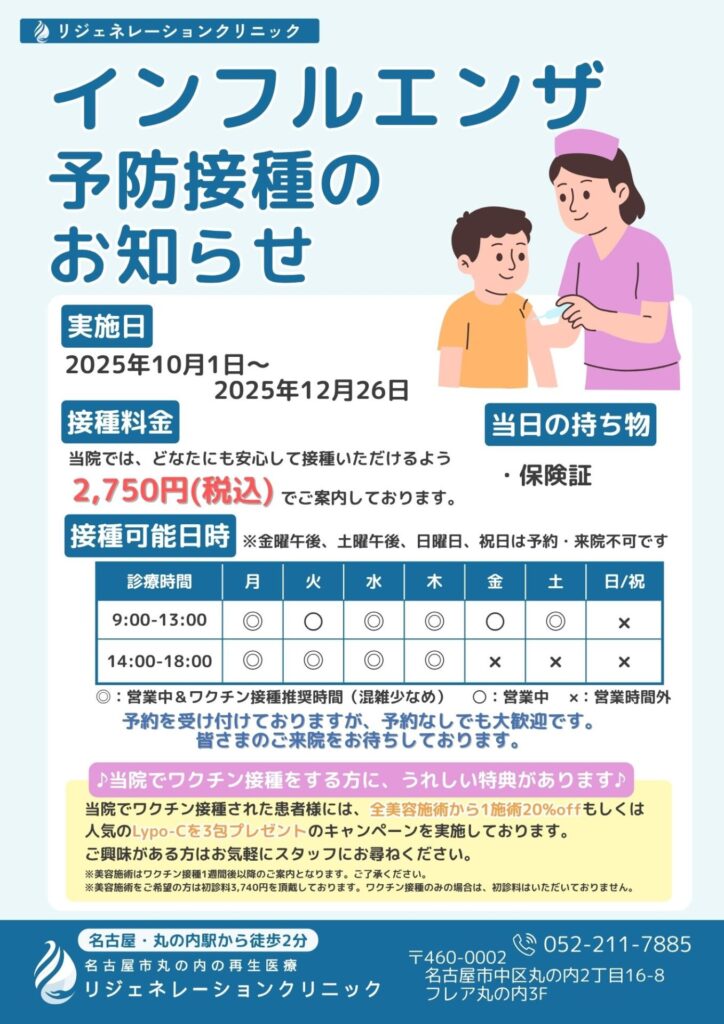 2025.10.02 お知らせ インフルエンザ予防接種について インフルエンザ予防接種の受付を開始いたしました。 ご予約をご希望の方は、お電話または当院受付にてお申し込みください。 接種期間 2025年10月1日(火)〜2025年12月26日(金) 接種料金 2,750円(1回目2回目ともに同額です) ※当院は、名古屋市の補助金の対象外となっております。 予約方法 お電話: 052-211-7885 受付: 診療時間内に直接お越しください。 注意事項 体調不良の場合は、接種をお控えください。 妊娠中、授乳中の方、その他ご不安な点がある方は、事前に医師にご相談ください。 その他、ご不明な点がございましたら、お気軽にお問い合わせください。 前の記事へ 次の記事へ 一覧へ戻る