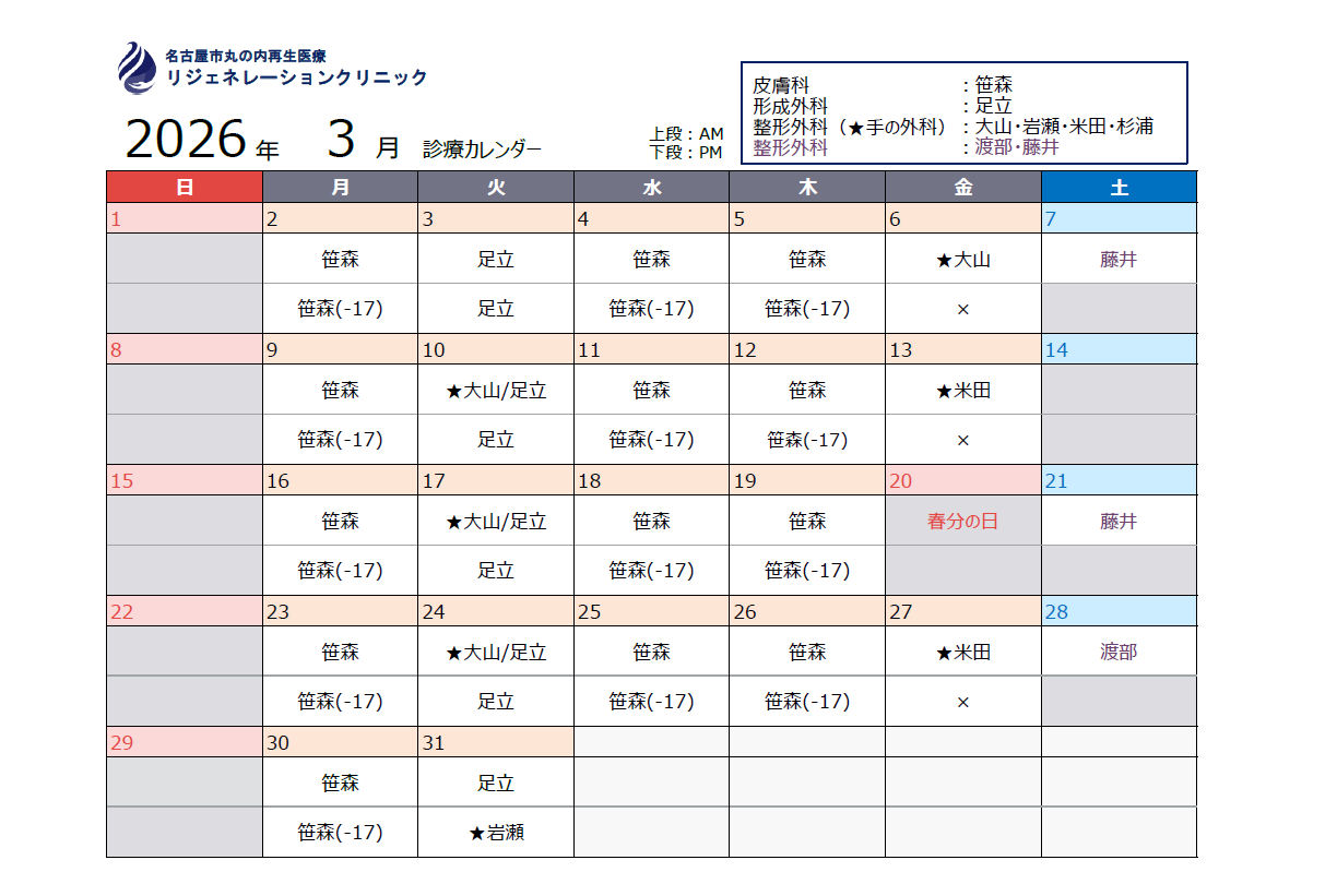 2026.02.24 お知らせ 3月の外来担当医のお知らせ 3月の外来担当医をお知らせします。 土曜日は混雑が予想されますので、事前のご予約をおすすめいたします。(予約優先制ですが、予約外での受診も可能です。) 3月14日土曜日は休診となっています。 皮膚科の笹森先生が3月末までの勤務となっております。4月以降の皮膚科外来は未定となっております。 前の記事へ 一覧へ戻る
